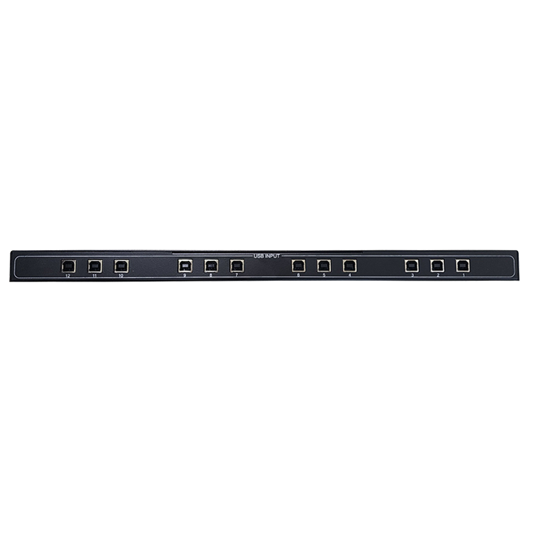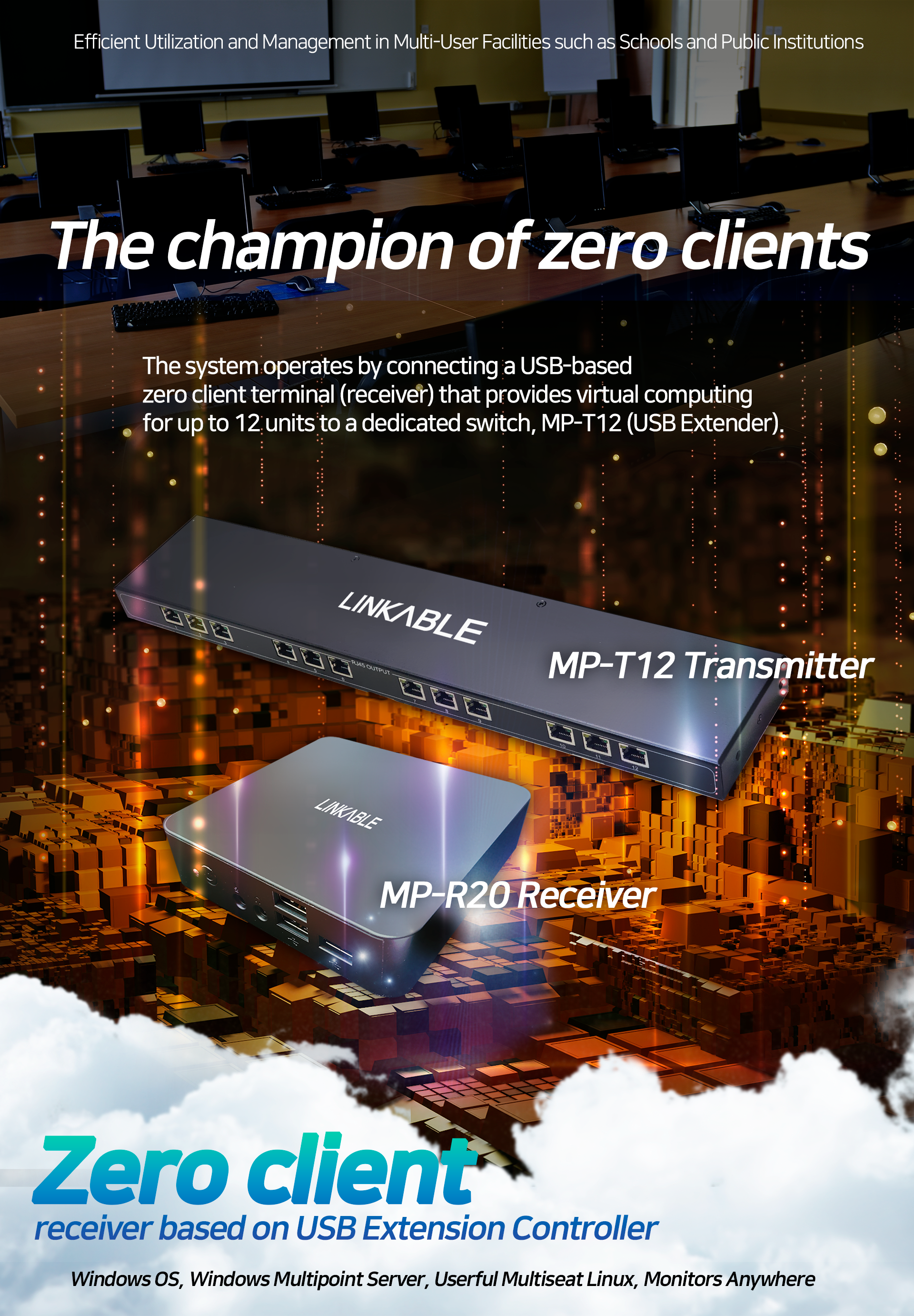 The system operates by connecting a USB-based zero client terminal (receiver) that provides virtual computing for up to 12 units to a dedicated switch, MP-T12 (USB Extender).